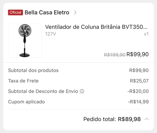 Boletei um aqui, estava precisando de um ventilador, coloquei nos alertas do Pelando, mas confesso que achei que iria conseguir pegar um de mesa por uns 80, não pensei em conseguir este por menos de 100 reais