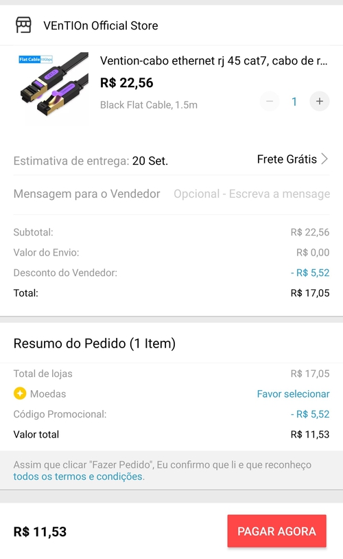 Lembrando que este e um exemplo de um cabo de 1,5m ainda tem de 0.5m, 1m ou de mais, o vendedor está Dando 5,52 de desconto e utilizando o cupom LAN828, ganha mais 5,52