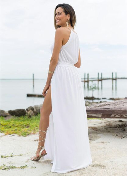 - Vestido longo com alças fixas de corrente no decote na cor dourado, com cós e elástico na cintura e fenda na lateral frente esquerda de quem veste