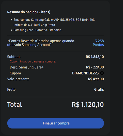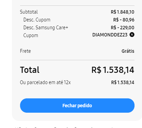 Não gostei do que a Samsung fez, tentei efetuar a compra porém o cartão bloqueou e a Samsung cancelou, voltei no app do cartão e fiz o desbloqueio da compra e quando fui efetuar a compra outra vez diz que o cupom de 5% não está disponível.