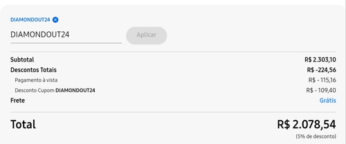 Comprei no cartão samsung e usei os pontos de rewards da Samsung. Gastei uns 13 mil pontos e deu uns 70 reais de desconto. Saiu 2119 parcelado.