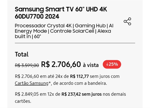 [VIP] Samsung Smart TV 60 Polegadas UHD 4K DU7700 2024, Processador Crystal 4K, Gaming Hub, AI Energy Mode, Controle SolarCell, HDR10+, Design Slim