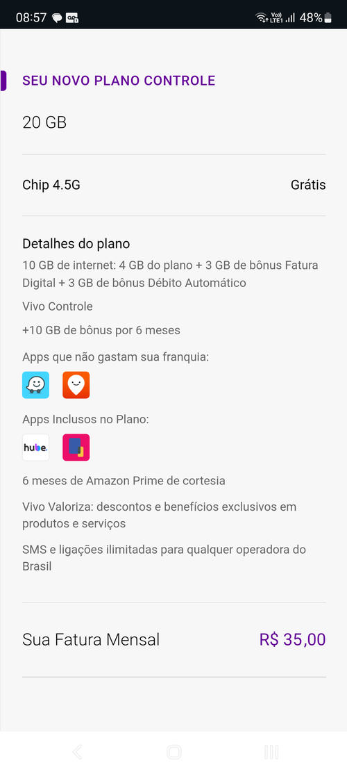 Boa, assinei o vivo controle a quase 1 ano, era 35 por 18gb por causa da promo de 6, meses, dps acabou e voltou pra 45 e abaixo os GB kkkkk vou ligar um alerta aqui no pelando pra essas promos de 6 meses. De brinde ainda veio amazon