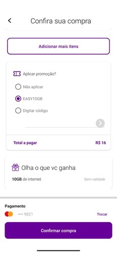 Mesmo assim comprei novamente pois, se necessário, vou judicializar. Dessa vez, gravei a tela. Os meus GB estão acabando e, se me travarem de comprar, eu fico com um chip sobrando uma porrada de diária de WhatsApp e quase 500 diárias de ligação sem Internet.