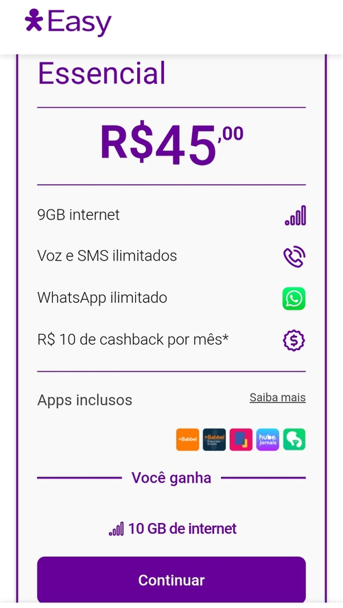 VIVO EASY PRIME - 12GB + R$10 DE CASHBACK + R$50 NO VALE BONUS TODO MÊS