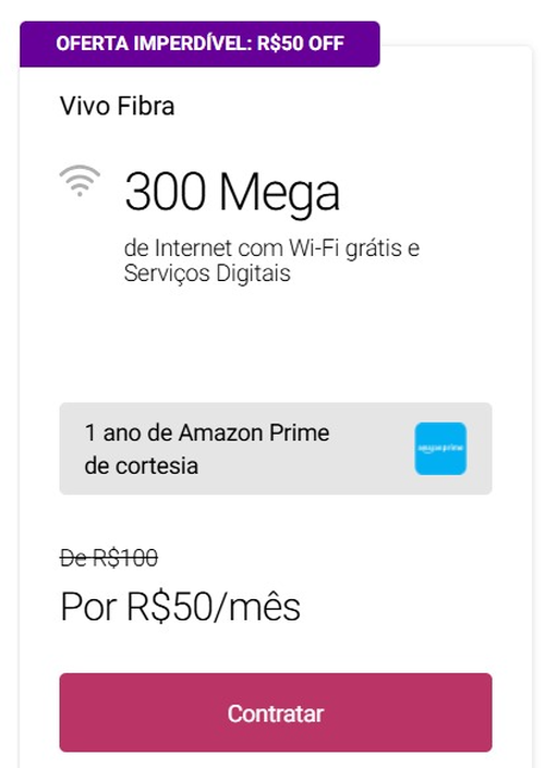 Esse de 50,00 era pra cidades específicas... Aqui já sou cliente vivo e não consegui ela na minha cidade mas consegui negociar com a equipe de retenção (cancelamento) que mudassem meu contrato de 200mb 110,00 para um de 600mb + Amazon prime por 80,00/mês...