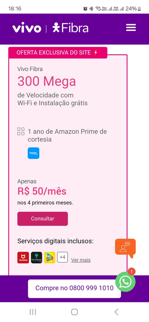 VIVO FIBRA - 300MB + AMAZON PRIME POR 1 ANO + McAfee + Roteador Grátis