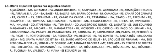 Oferta disponível apenas nas seguintes Cidades: AÇAILÂNDIA - MA, ALTAMIRA - PA, ANGRA DOS REIS - RJ, ARACRUZ - ES, ARAPIRACA - AL, ARARUAMA - RJ, ARMAÇÃO DE BUZIOS - RJ, ARRAIAL D AJUDA - BA, BAGE - RS, BALSAS - MA, BARRA DO PIRAÍ - RJ, CALDAS NOVAS - GO, CAMAQUA - RS, CANAÃ DOS CARAJAS - PA, CANELA - RS, CAPANEMA - PA, CAPÃO DA CANOA - RS, CASTANHAL - PA, CATALÃO - GO, CRATO - CE, ERECHIM - RS, EUNAPÓLIS - BA, FORMOSA - GO, GRAMADO - RS, IBIRITÉ - MG, IGUABA GRANDE - RJ, ILHEUS - BA, IMPERATRIZ - MA, ITAPERUNA - RJ, ITUMBIARA - GO, JUAZEIRO DO NORTE - CE, LAGARTO - SE, LUIS EDUARDO MAGALHAES - BA, MACAPA - AP, MANGARATIBA - RJ, MORRINHOS - GO, MOSSORÓ - RN, OSÓRIO - RS, PAÇO DO LUMIAR - MA, PARAGOMINAS - PA, PARATY - RJ, PARAUAPEBAS - PA, PARNAÍBA - PI, PARNAMIRIM - RN, PATOS - PB, PETROPÓLIS - RJ, PICOS - PI, PORTO SEGURO - BA, REDENÇÃO - PA, RESENDE - RJ, RIO BONITO - RJ, SANTA INÊS - MA, SANTA LUZIA - MG, SANTA MARIA DE JETIBA - ES, SANTA ROSA - RS, SANTO ANGELO - RS, SANTO ANTÔNIO DE JESUS - BA, SÃO JOSÉ DE RIBAMAR - MA, SÃO MATEUS - ES, SÃO PEDRO DA ALDEIA - RJ, SOBRAL - CE, SORRISO - MT, TANGARÁ DA SERRA - MT, TAQUARA - RS, TEIXEIRA DE FREITAS - BA, TERESOPÓLIS - RJ, TRAMANDAÍ - RS, TRANCOSO - BA, TRÊS CORACOES - MG, TRÊS DE MAIO - RS, TRÊS LAGOAS - MS, TRÊS PONTAS - MG, TRÊS RIOS - RJ, TUCURUI - PA, VALENCA - RJ, VARGINHA - MG, VIANA - ES e XANGRI LÁ - RS