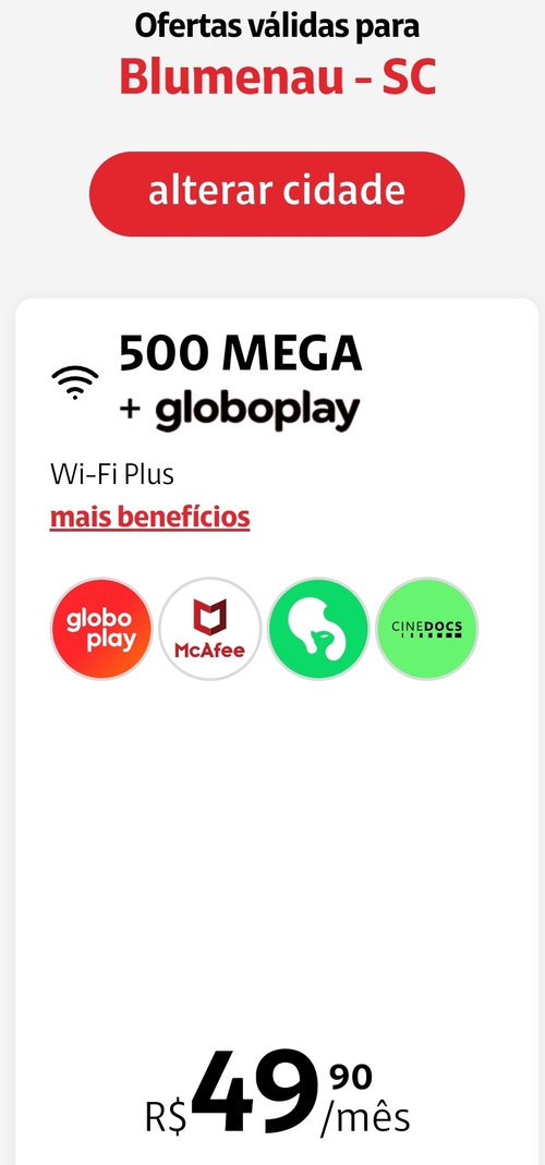 **Oferta de 500Mega por R$ 100/Mês válida em algumas cidades. Para conferir as cidades participantes, clique aqui.