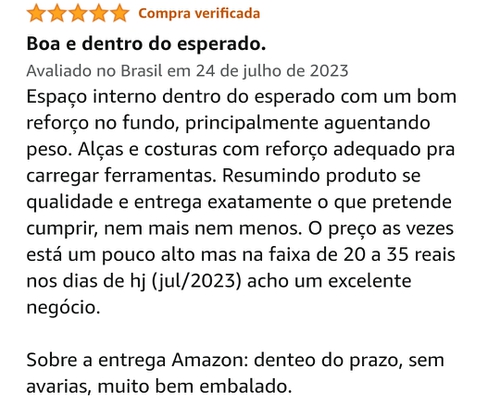 Tenho uma. O preço está bom. O material é resistente e possui compartimentos externos. As alças são firmes. É uma opção leve e bonita para transportar ferramentas.