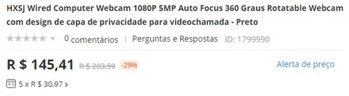 Webcam HXSJ 1080P 5MP Auto Focus 360 | R$116