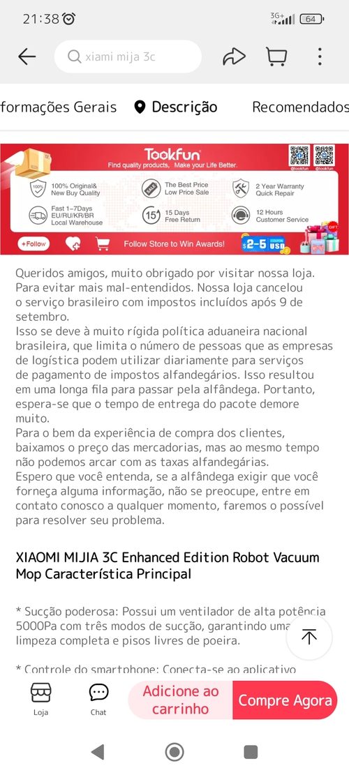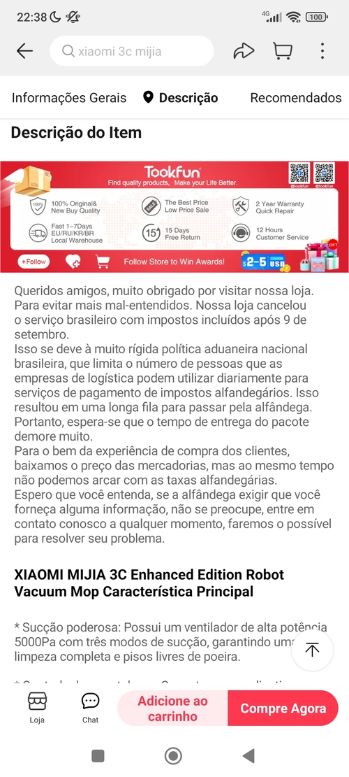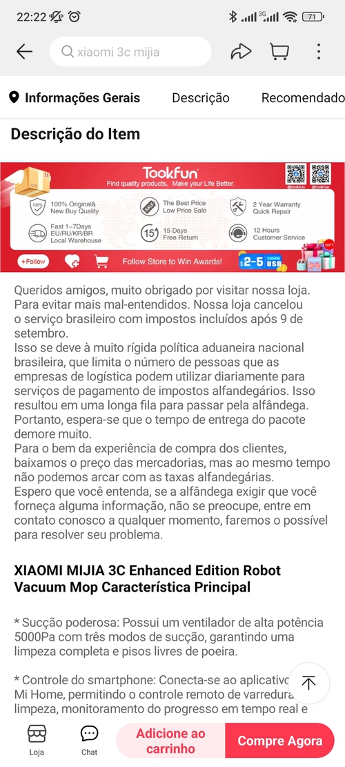 Excelente robô, comprei alguns meses atrás, desse mesmo vendedor. Porém o anúncio estava diferente, na imagem do produto estava com destaque com a bandeira do brasil e informava que era isento de taxas. A minha compra foi taxada em 580, o vendedor demorou um pouco para pagar, mas veio tudo certo.