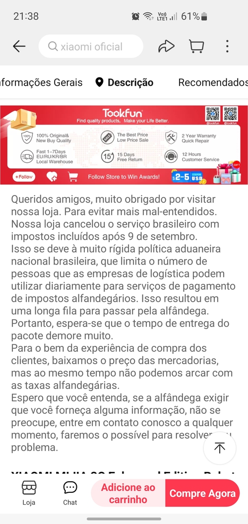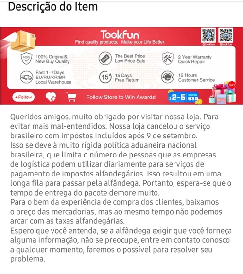 Queridos amigos, muito obrigado por visitar nossa loja. Para evitar mais mal-entendidos. Nossa loja cancelou o serviço brasileiro com impostos incluídos após 9 de setembro.