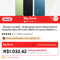 [No Brasil] Xiaomi Redmi Note 14 8GB 256GB 108MP Tela 120Hz AMOLED