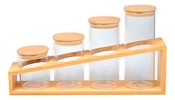 Jogo De Porta Condimentos Vidro C/ Tampa Suporte Bambu 4 Pçs