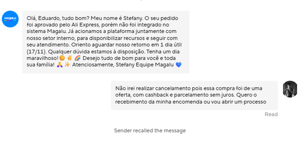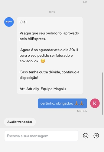 9h Mensagem da magalu para aguardar 1 dia no chat da magalu no Aliexpress
