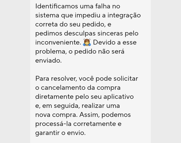 ATUALIZAÇÃO: Após receber a mensagem deles pedindo pra cancelar o pedido, mandei uma resposta dentro do próprio chat do Alexpress, exigindo o cumprimento da oferta para que não tenha que levar o problema pra outras plataformas, como RA e Procon. Um dia depois eles integraram meu pedido manualmente, e ja recebi a confirmação do pedido no WhatsApp.